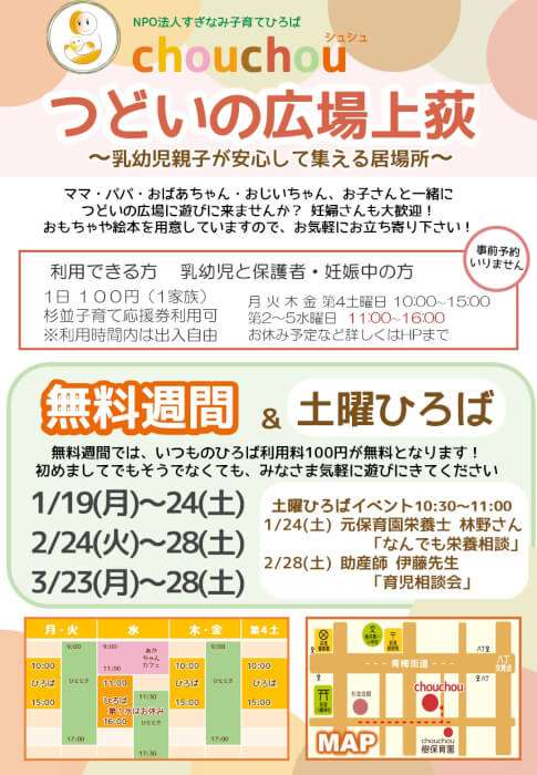 ☆ひろば入室の際は、手洗い、または手指の消毒をお願いします。☆ランチタイムは当面の間設けません。食事の摂取はご遠慮ください。水分補給は適宜行ってください。